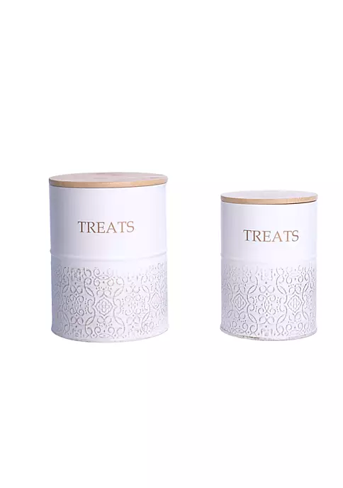 These Swan White Modern Farmhouse Treat Canisters come in a nested two pack. Made with a bamboo lid and a patterned textured design these sophisticated canisters will look good in your home and make your dog feel extra special.