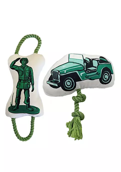 Our Retro Military Plush Dog Toy combo features custom graphics inspired by WW2 army surplus stores. The front side is made of durable canvas with a digital print of non-toxic ink, while the backside is soft fleece for comfort and cuddles.