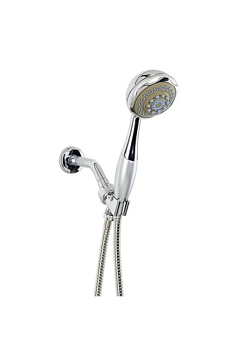Bath Bliss four Function Shower Head with four settings for optimal and various types of use in one convenient shower head. Shower Head comes with a 60 inch polished stainless steel no tangle hose, one shower wand, and one stainless steel mounting bracket and a 1 meter roll of teflon tape. Hose contains brass fittings on each end to ensure a secure fit. Shower head contains a push button at base of head for easy access to switch between each of the available settings.
