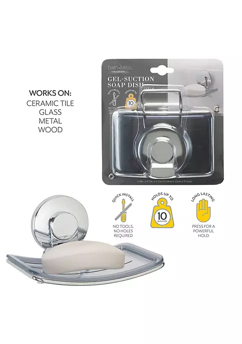 A soap dish you can put in your shower or by your sink, the Bath Bliss gel suction soap dish. A convenient caddy with gel power suction can be placed on any smooth surface. Strong enough to hold up to 10lbs and perfect size for 1 large bar of soap.