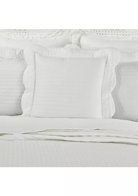 Bring Farmhouse charm to your home with the Amherst Throw Pillow. Featuring detailed channel quilt stitching with a soft 3.5” relaxed scallop flange trim. Constructed with soft, pre-washed 100% cotton to make this pillow the perfect snuggling companion. Available in a choice of four colorways. The center is a true white, and the reverse fabric matches the solid colored flange. Coordinates with the Amherst Collection (removable pillow insert included). 1 20″ Square Quilted Decorative Throw Pillow: 20-In. X 20-In.