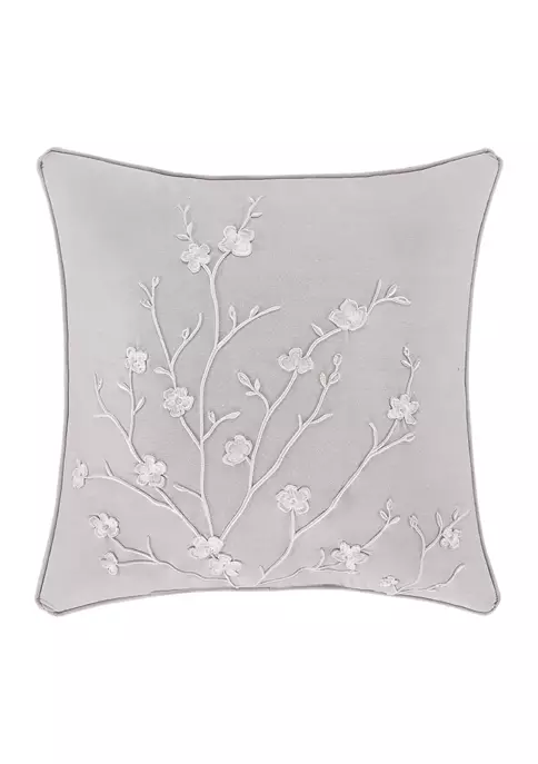 The Cherry Blossom 20-inch decorative throw pillow is beautifully crafted with a unique raised embroidered floral design in white thread to emphasize the soft neutral gray fabric.