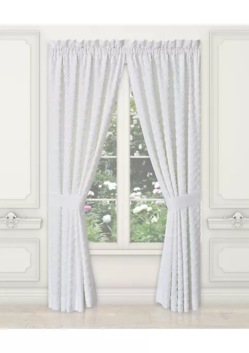 This English cottage inspired window panel pair freshens your space with clean crisp jacquard fabric in a timeless lattice pattern, creating soft and subtle dimension and texture. The Lillian rod pocket window panels include tiebacks and offer room darkening shade. Complete the look with the Lillian bedding collection. 84″ Window Panel Pair: 84-In. X 50-In.