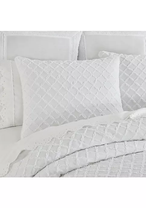 The Lillian Comforter set features a unique clipped jacquard fabric in a timeless lattice pattern, creating soft and subtle dimension and feathery texture. Overfilled and oversized, the comforter is finished with a clean edge and reverses to 100% solid white cotton. This crisp white set is beautiful on its own or layered together with the cottage-inspired looks of the Piper & Wright collection. Full/Queen 3Pc. Comforter Set: 96-In. X 92-In.